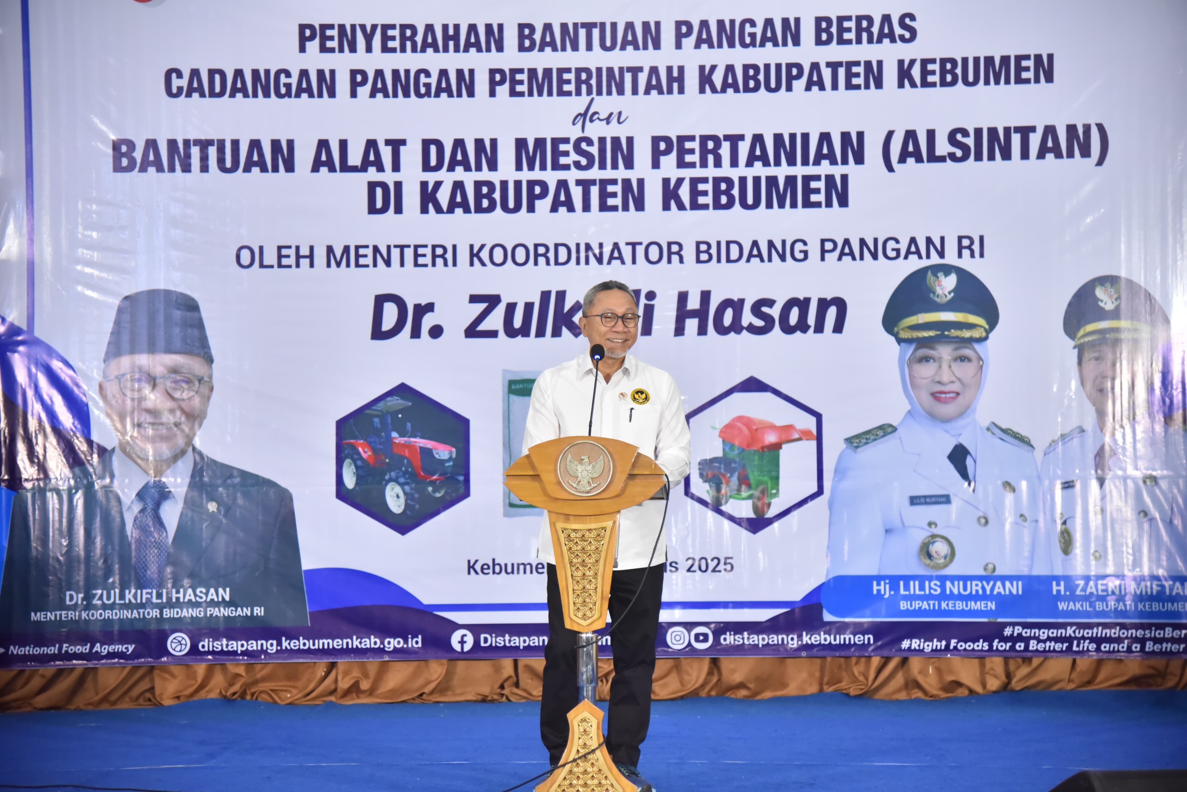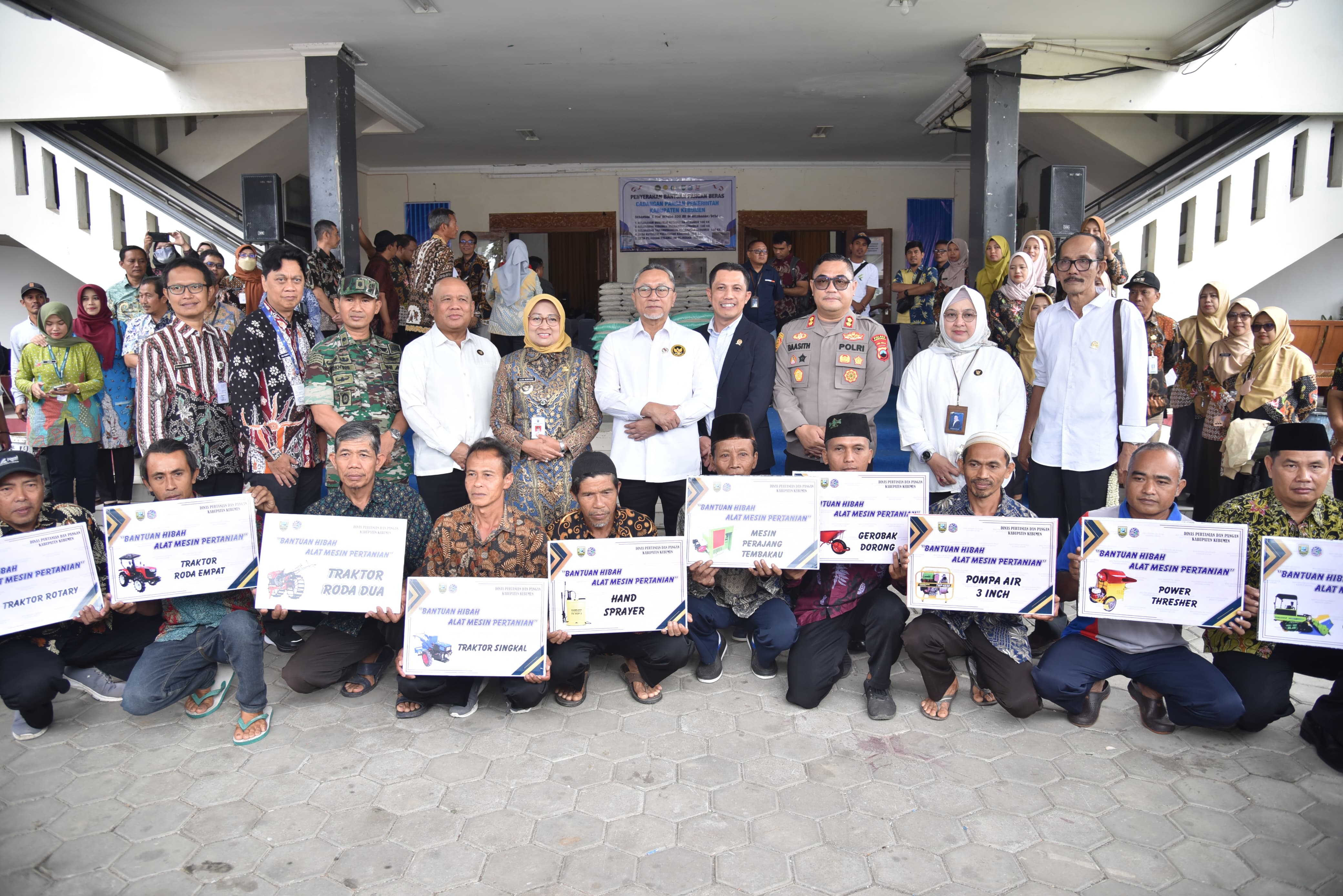 Setelah dari Desa Bojongsari, kunjungan dilanjutkan ke Gedung Pertemuan Setda Kebumen. Di sana, Menko Zulkifli Hasan dan Bupati Lilis Nuryani secara simbolis menyerahkan bantuan pangan dan Alat dan Mesin Pertanian (Alsintan).