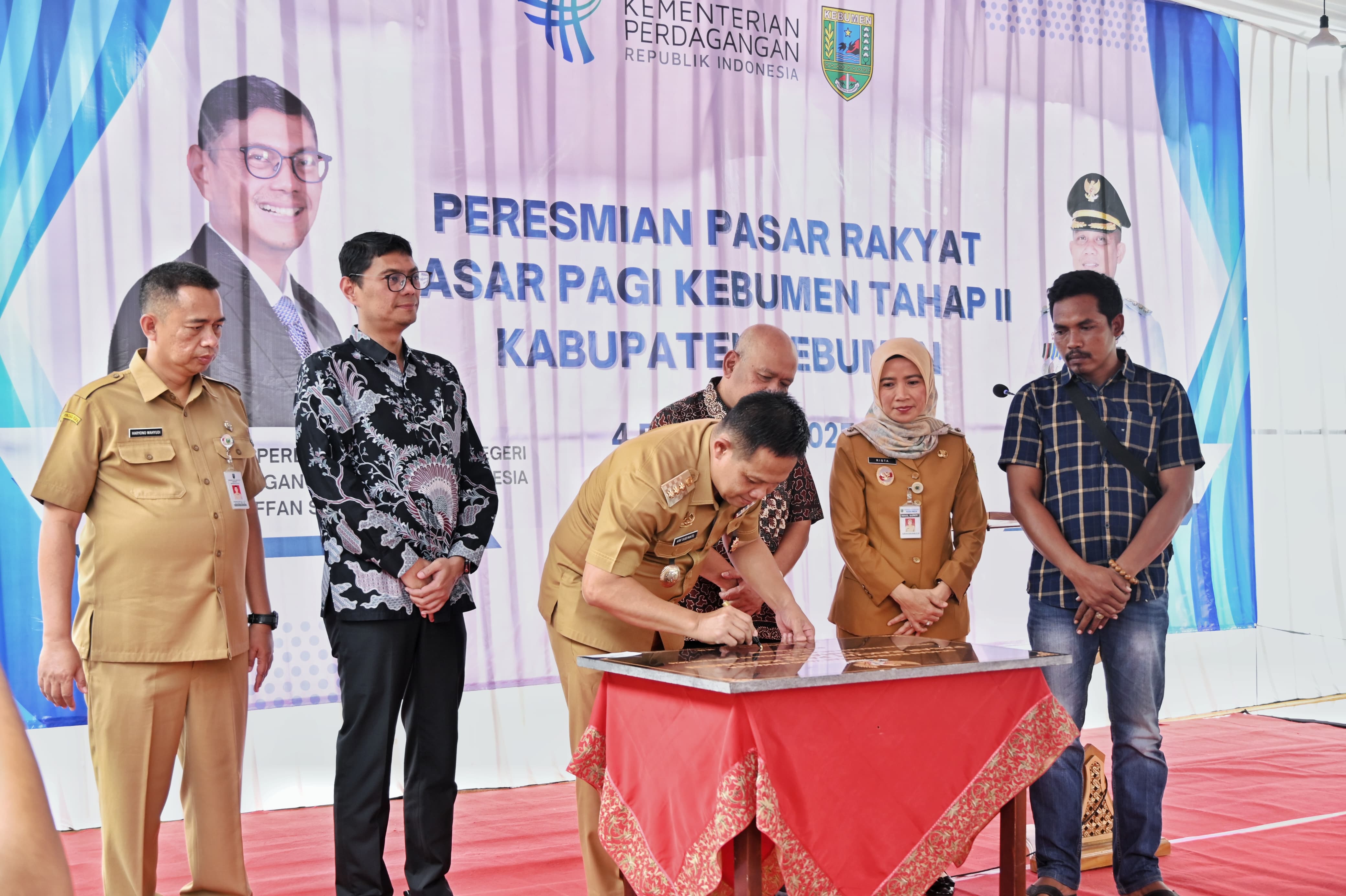 KEBUMEN - Direktur Jenderal Perdagangan Dalam Negeri Kementerian Perdagangan RI Iqbal Soffan Shofwan menghadiri acara Peresmian Pasar Rakyat Pasar Pagi Kebumen. Peresmian dilakukan oleh Bupati Kebumen Arif Sugiyanto, ditandai dengan penandatangan prasasti, Selasa 4 Februari 2025.