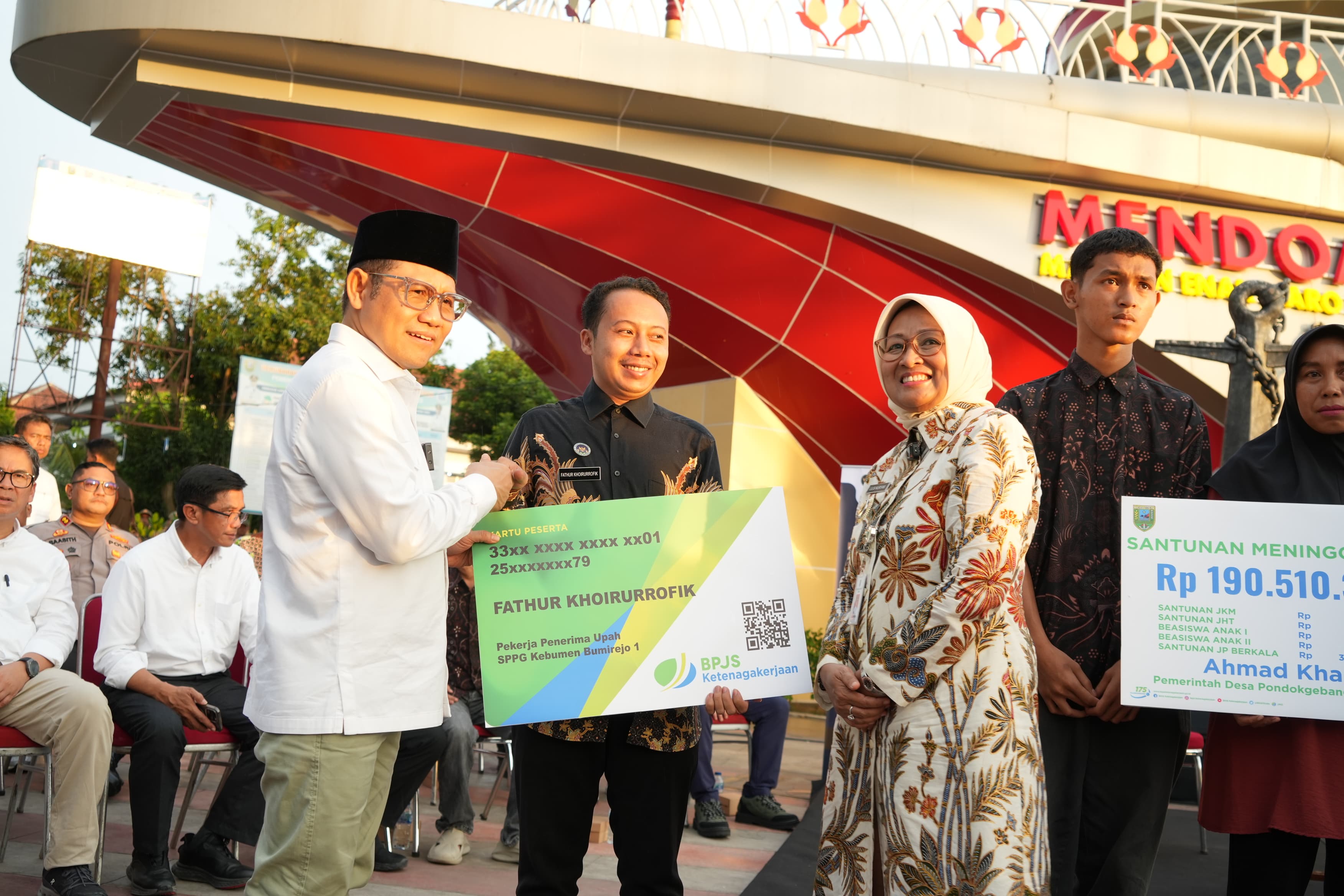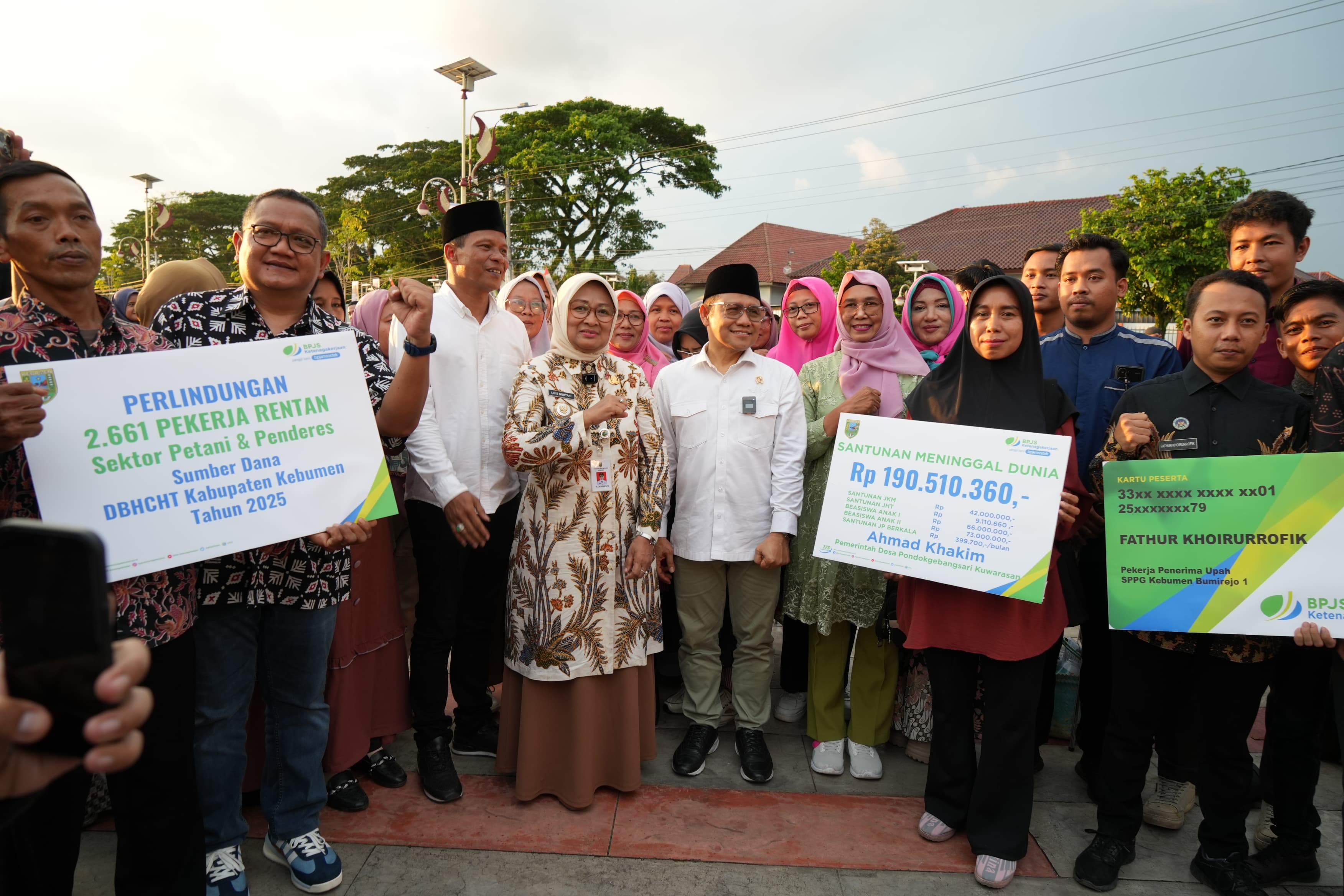 Juga diserahkan santunan BPJS Ketenagakerjaan sebesar Rp190.510.360 kepada ahli waris almarhum Ahmad Khakim, perangkat Desa Pondok Gebangsari, Kecamatan Kuwarasan. Santunan ini mencakup santunan kematian, Jaminan Hari Tua (JHT), beasiswa untuk dua anak, dan pensiunan bulanan.