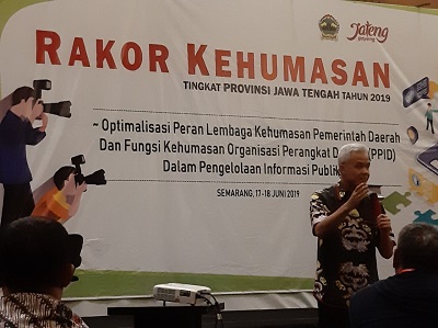 KEBUMENKAB.GO.ID - Pemerintah Provinsi Jawa Tengah menyelenggarakan Rapat Koordinasi Bidang Kehumasan. Rakor kali ini diselenggarakan untuk menindaklanjuti surat Menteri Dalam Negeri nomor 046/218/Bangda dan nomor 046/219/bangda perihal penyelenggaraan urusan pemerintahan daerah bidang komunikasi dan informatika serta surat edaran Menteri Dalam Negeri no 480/350/SJ tanggal 6 mei 2019 tentang penunjukan juru bicara di lingkungan daerah. Rakor yang berlangsung dari hari senin sampai selasa 17 - 18 Juni 2018 berlangsung di Hotel Santika Semarang ini diikuti oleh para kepala Dinas Kominfo kepala bagian humas dan kepala bagian organisasi seluruh kabupaten kota di Jawa Tengah. Rakor kehumasan yang mengambil tema " Optimalisasi peran lembaga kehumasan pemerintah daerah dan fungsi kehumasan organisasi perangkat daerah (PPID) dalam pengelolaan informasi publik" dibuka oleh Gubernur Jateng Ganjar Pranowo. Dalam sambutannya Ganjar menyampaikan agar Humas Kabupaten Kota dapat melaksanakan tupoksinya dengan baik agar program pemerintah bisa sampai ke masyarakat. Humas dan Kominfo menyampaikan pesan ke masyarakat dengan cara yang " casual" sehingga dapat dengan mudah diterima oleh masyarakat. Ganjar juga menyinggung terkait PPDB tahun ini yang menggunakan Sistem Zonasi diharapkan agar pemerintah kab kota untuk dapat memberikan informasi kepada masyarakat karena kebijakan ini sudah dibahas secara matang oleh para pakar ditingkat pusat.