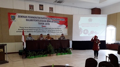 Menyadari pentingnya kesiapan pelaksanaan Pilbup 2020 mendatang, Kantor Kesatuan Bangsa dan Politik (Kesbangpol) Kabupaten Kebumen, menyelenggarakan seminar kebangsaan bertajuk " Peran Serta Masyarakat Dalam Penanggulangan dan Penanganan Konflik Sosial, Dalam Rangka Antisipasi Terhadap Potensi Kerawanan di Kabupaten Kebumen Menyambut Pilbup 2020". Seminar yang diikuti 120 peserta dari berbagai unsur masyarakat ini berlangsung di Hotel Mexolie Kebumen dengan menghadirkan narasumber Asisten dua Sekda Kebumen Drs Heri Setyanto, dari Polres Kebumen AKP Yusuf, serta naerasumber dari Pusat studi keamanan dan perdamaian UGM Jogyakarta Farid Cahyono M.Sc, dan Kesbangprov Jawa Tengah Dra Hj Atik Suniarti MSi Kamis (31/10).