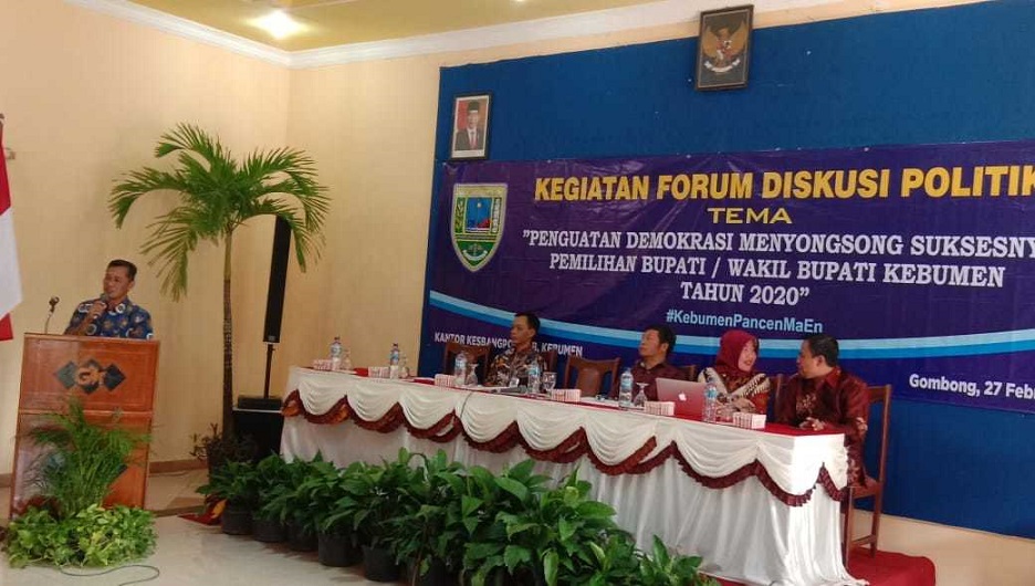 KEBUMEKAB.GO.ID – Dalam rangka meningkatkan kesadaran akan hak dan kewajiban dalam Pemilu serta meningkatkan kesadaran demokrasi baik kwalitatif maupun kwantitatif jelang proses Pemilihan Bupati/Wakil Tahun 2020, Kantor Kesbangpol Kabupaten Kebumen menyelenggarakan Forum Diskusi Politik dengan tema "Penguatan Demokrasi Menyongsong Suksesnya Pemilihan Bupati/Wabup Kebumen Tahun 2020". Acara yang berlangsung di Hotel Grafika Gombong, Kamis (27/2) diikuti oleh sekitar 150 peserta yang terdiri dari Kepala Desa, anggota ormas dan tokoh masyarakat dari Kecamatan Gombong, Sempor dan sekitarnya.