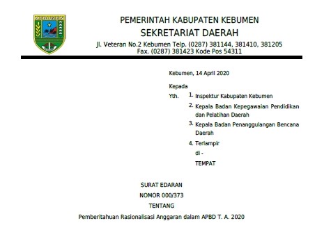 KEBUMENKAB.GO.ID - Sekretaris Daerah Kabupaten Kebumen, H. Ahmad Ujang Sugiono SH menerbitkan Surat Edaran Nomor 000/373 tentang Rasionalisasi Anggaran dalam APBD Tahun Anggaran 2020. Surat Edaran tertanggal 14 April 2020 ini merupakan tindak lanjut dari sejumlah peraturan maupun instruksi Pemerintah Pusat dalam upaya percepatan penanganan Covid-19 di daerah.