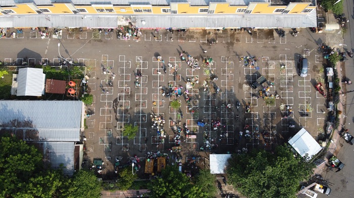 Ya, kini halaman depan Pasar Tumenggungan telah ditata sedemikian rupa dan menerapkan physical distancing/ sosial distancing. Langkah ini diambil untuk memutus mata rantai penularan COVID-19. Penjual atau pedagang kini didesain khusus dengan jarak antara kios satu dengan yang lain. Jarak antara pembeli juga diatur sedemikian rupa, sehingga tidak terjadi persinggungan atau kontak fisik baik penjual maupun pembeli yang satu dengan pembeli yang lain. Setidaknya dengan cara ini, penularan COVID-19 bisa dihindari.