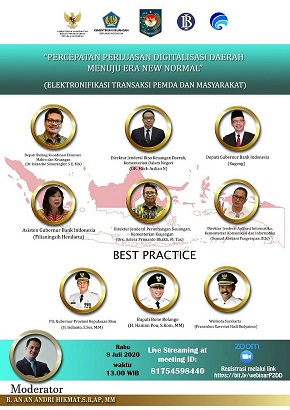Narasumber dari Bank Indonesia mengetengahkan materi tentang Percepatan dan Perluasan digitalisasi daerah menuju era New Normal, dari Kemendagri menyampaikan paparan tentang Peran Pemda dalam Penerapan dan Pengembangan ETP. Sedangkan dari Kemenkeu memaparkan Championship Percepatan dan Perluasan Digitalisasi Daerah dan Kebijakan Dana Insentif Daerah, serta dari Kemenkominfo menyampaikan materi dengan topik Percepatan dan Perluasan Digitalisasi Daerah.