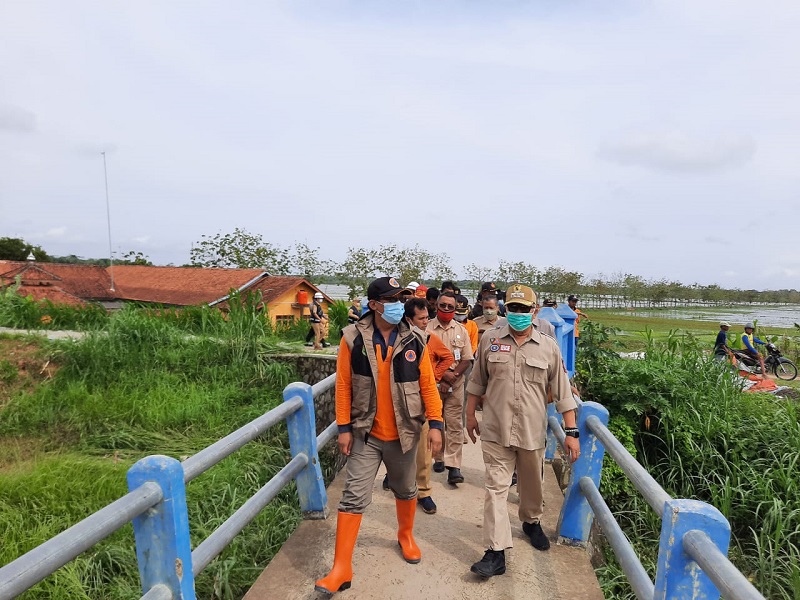 Bupati KH Yazid Mahfudz langsung meninjau tanggul jebol di Desa Madureja, Kecamatan Puring, Senin (26/10). Sejumlah pejabat mendampingi Bupati, diantaranya Sekda H Ahmad Ujang Sugiono, Kepala DPU PR Haryono Wahyudi, Plt Kalakhar BPBD Teguh Kristiyanto serta sejumlah pejabat lainnya.