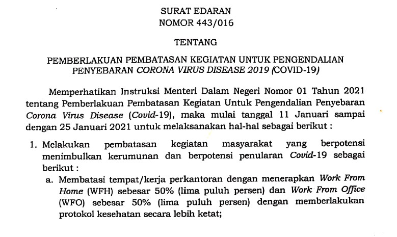 "Melakukan pengaturan pemberlakuan pembatasan kegiatan masyarakat mulai 11 Januari sampai dengan 25 Januari 2021 dengan berpedoman pada Inmendagri nomor 1 tahun 2021," bunyi surat tertanggal 8 Januari 2021 yang ditandatangani Ganjar Pranowo.