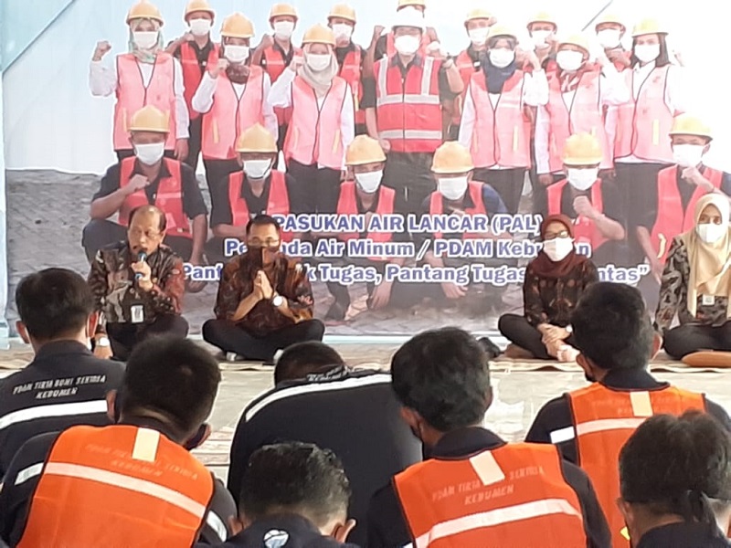 KEBUMENKAB.GO.ID - Sekda Ahmad Ujang Sugiono memberikan pembinaan dan pengarahan pada karyawan Perumda Air Minum Tirta Bumi Sentosa, Kamis (6/4). Ia pun mendorong agar peningkatan pelayanan terus dilakukan, agar target Tahun 2021 dapat tercapai.