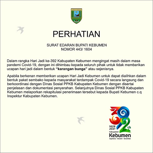 Untuk itu, dalam Surat Edaran Bupati Nomor 443/1604, Bupati Kebumen Arif Sugiyanto meminta atau mengimbau kepada siapapun masyarakat agar tidak mengirimkan karangan bunga sebagai bentuk ucapan selamat atas peringatan Hari Jadi Kebumen.