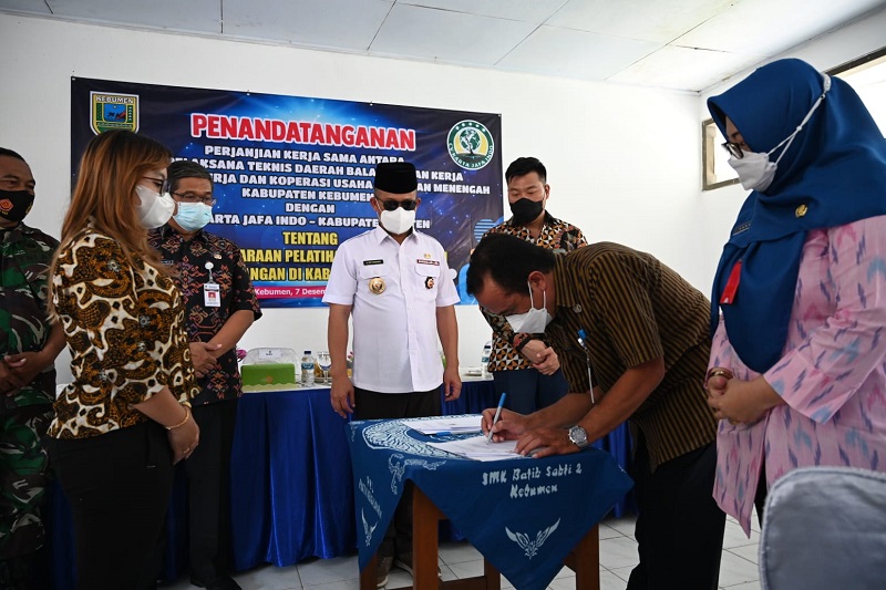 MoU antara Unit Pelaksana Teknis Daerah Balai Latihan Kerja Dinas Tenaga Kerja Dan Koperasi Usaha Kecil dan Menengah Kabupaten Kebumen Dengan CV Karta Jafa Indo Kabupaten Klaten berlangsung di UPTD BLK Disnaker KUKM, Kebumen, Selasa (7/12).