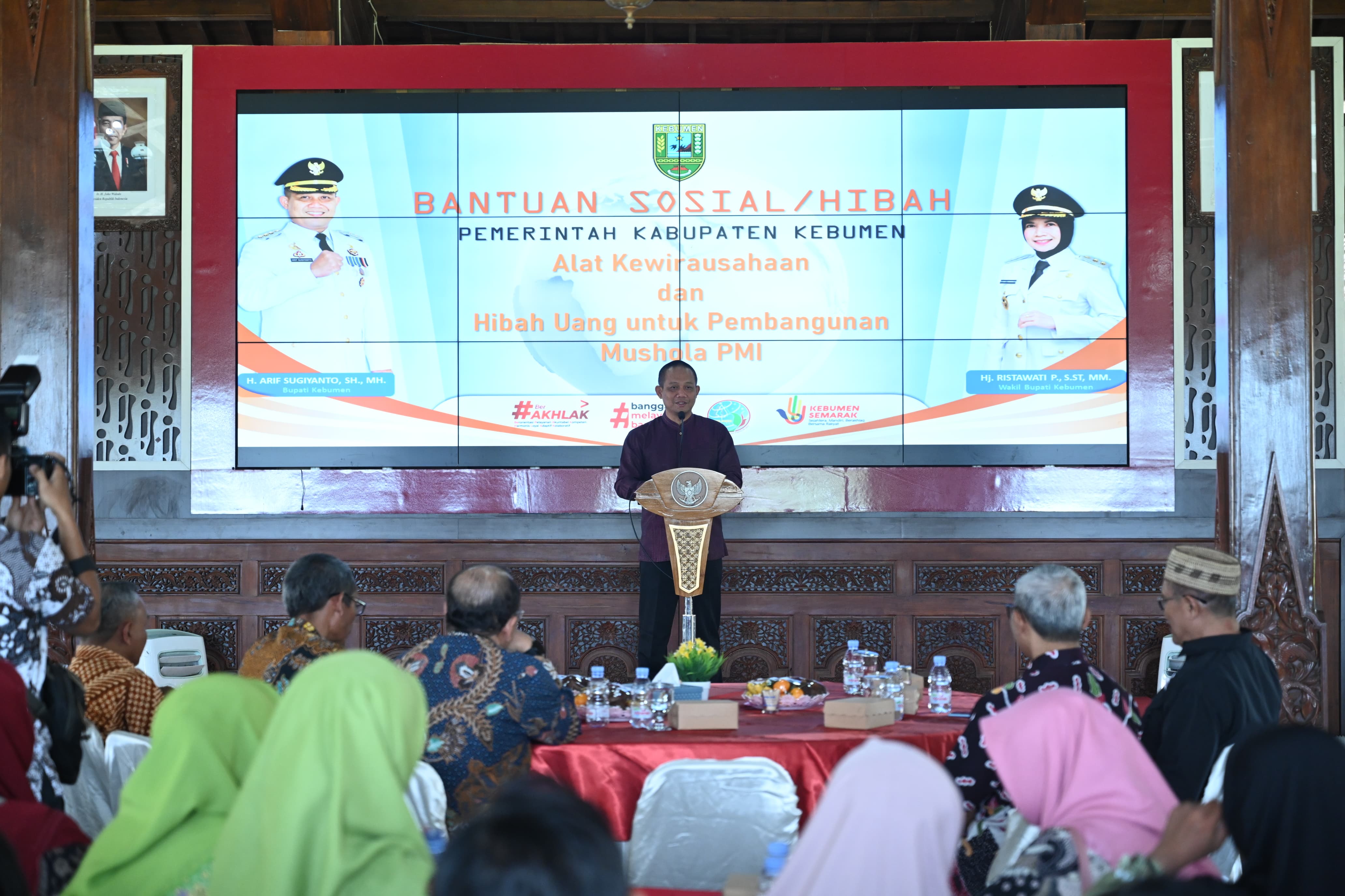 KEBUMEN - Bupati Kebumen Arif Sugiyanto menyerahkan bantuan alat-alat kewirausahaan kepada 140 penerima, baik itu kelompok usaha maupun perorangan. Bantuan secara simbolis diberikan di Pendopo Kabumian, Kamis (21/12/2023).