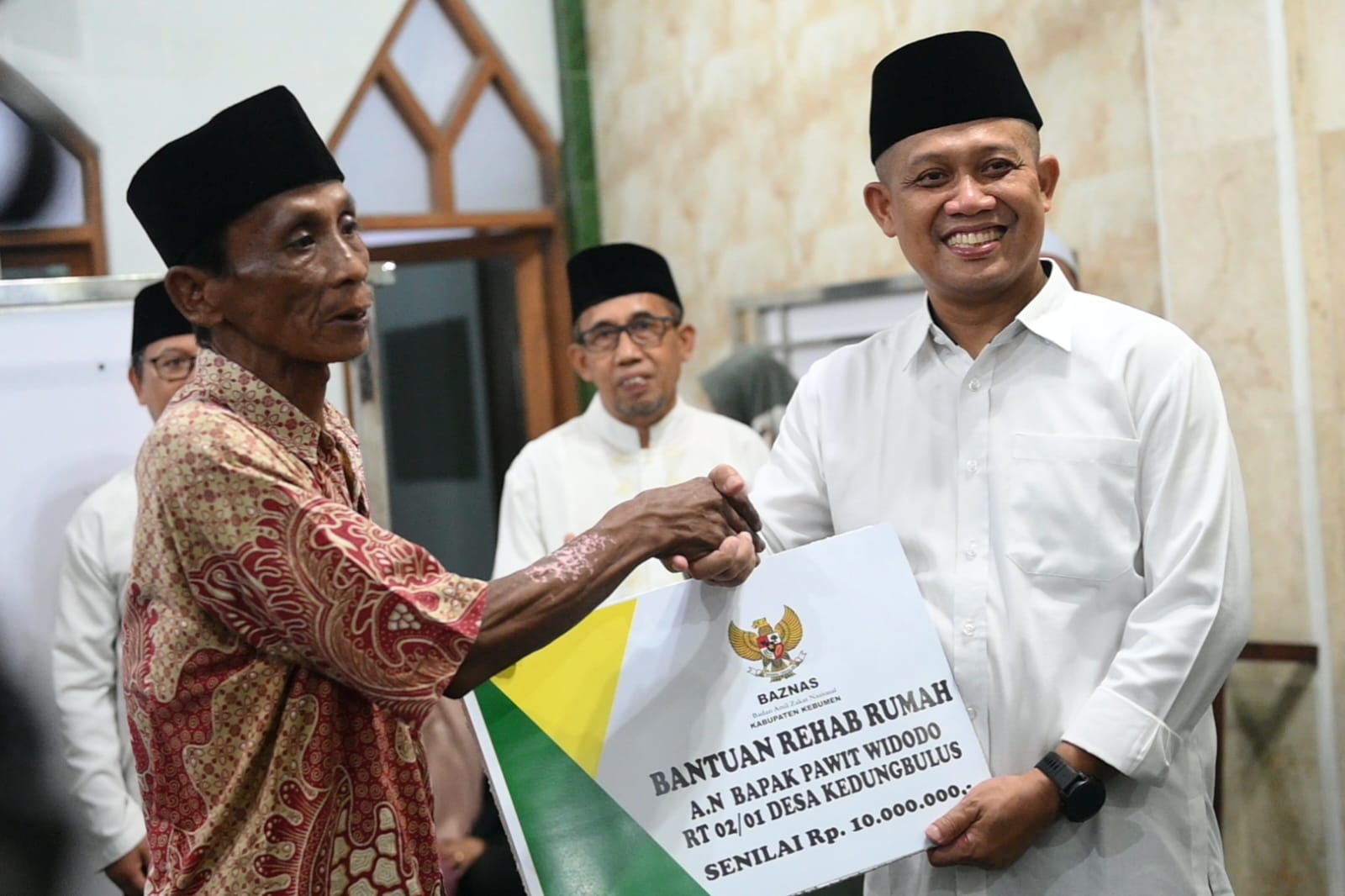 Pada shalat tarawih ini, Bupati menyerahkan bantuan rehab rumah dari BAZNAS Kabupaten Kebumen kepada dua orang penerima dengan total nilai Rp10 juta dan Rp12 juta. Selain itu juga diberikan bantuan paket sembako untuk para jamaah masjid, serta bantuan musfhaf Al-Quran. Bupati juga memberikan satu paket umroh gratis untuk Takmir masjid setempat.