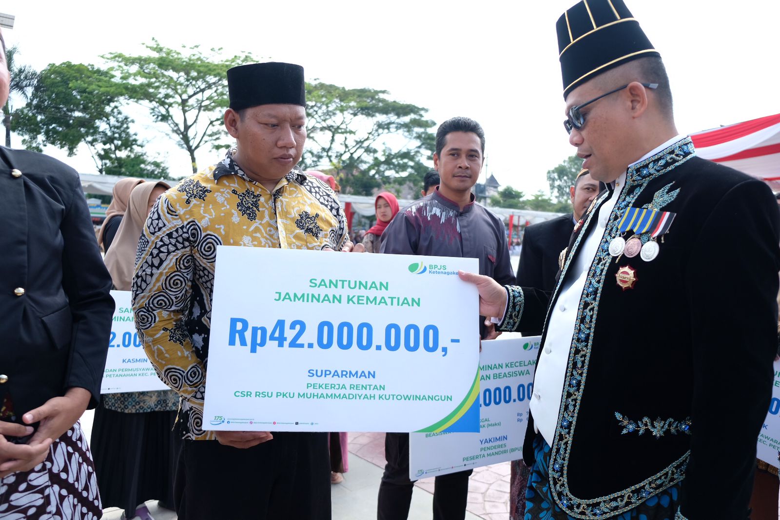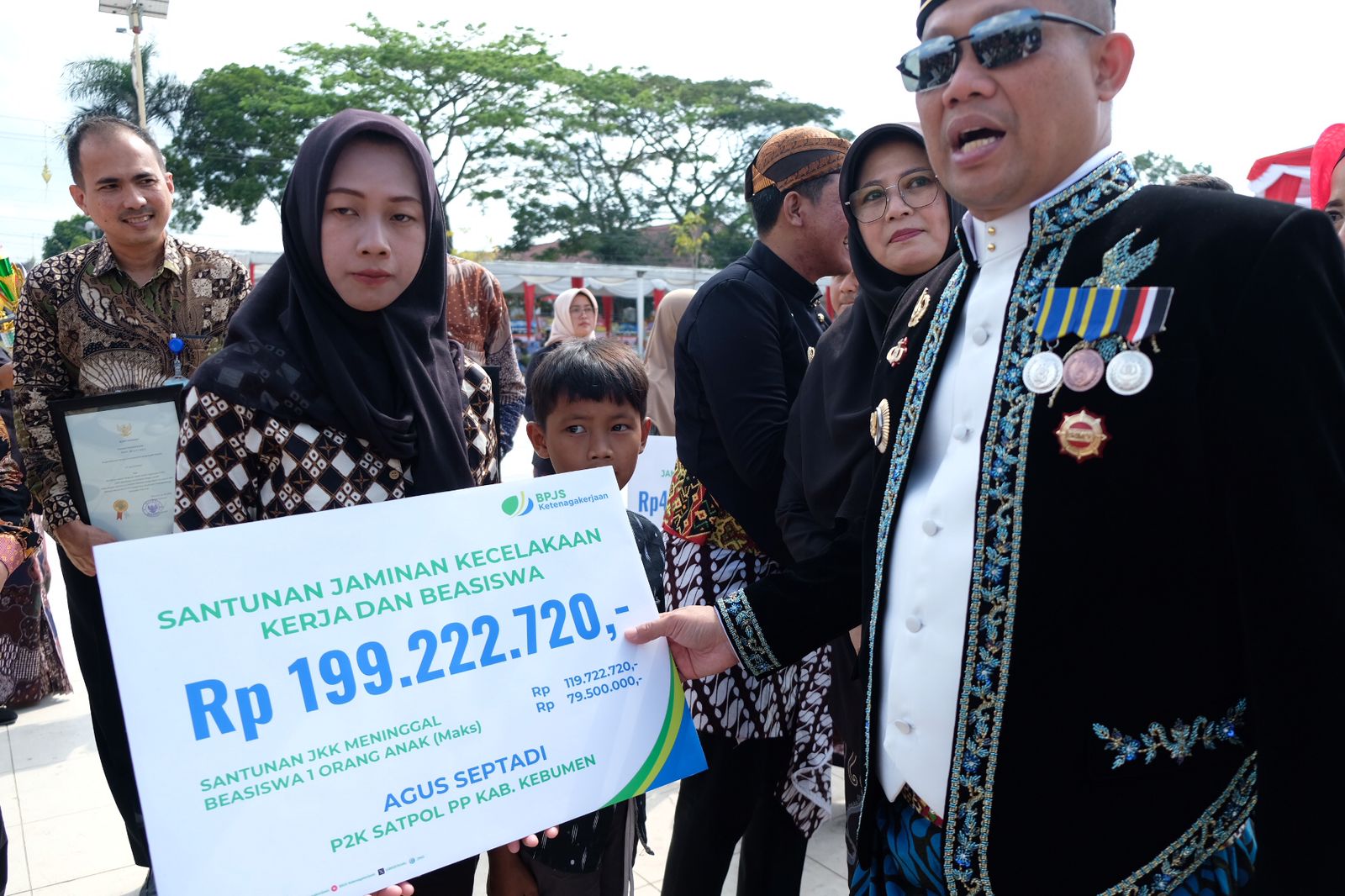 KEBUMEN - Bupati Kebumen Arif Sugiyanto telah menyerahkan santunan Jaminan Kematian (JKM) kepada enam orang ahli waris yang disalurkan melalui BPJS Ketenagakerjaan. Penyerahan dilakukan pada saat peringatan Hari Jadi Kebumen ke 395 di Alun-alun Pancasila Kebumen.