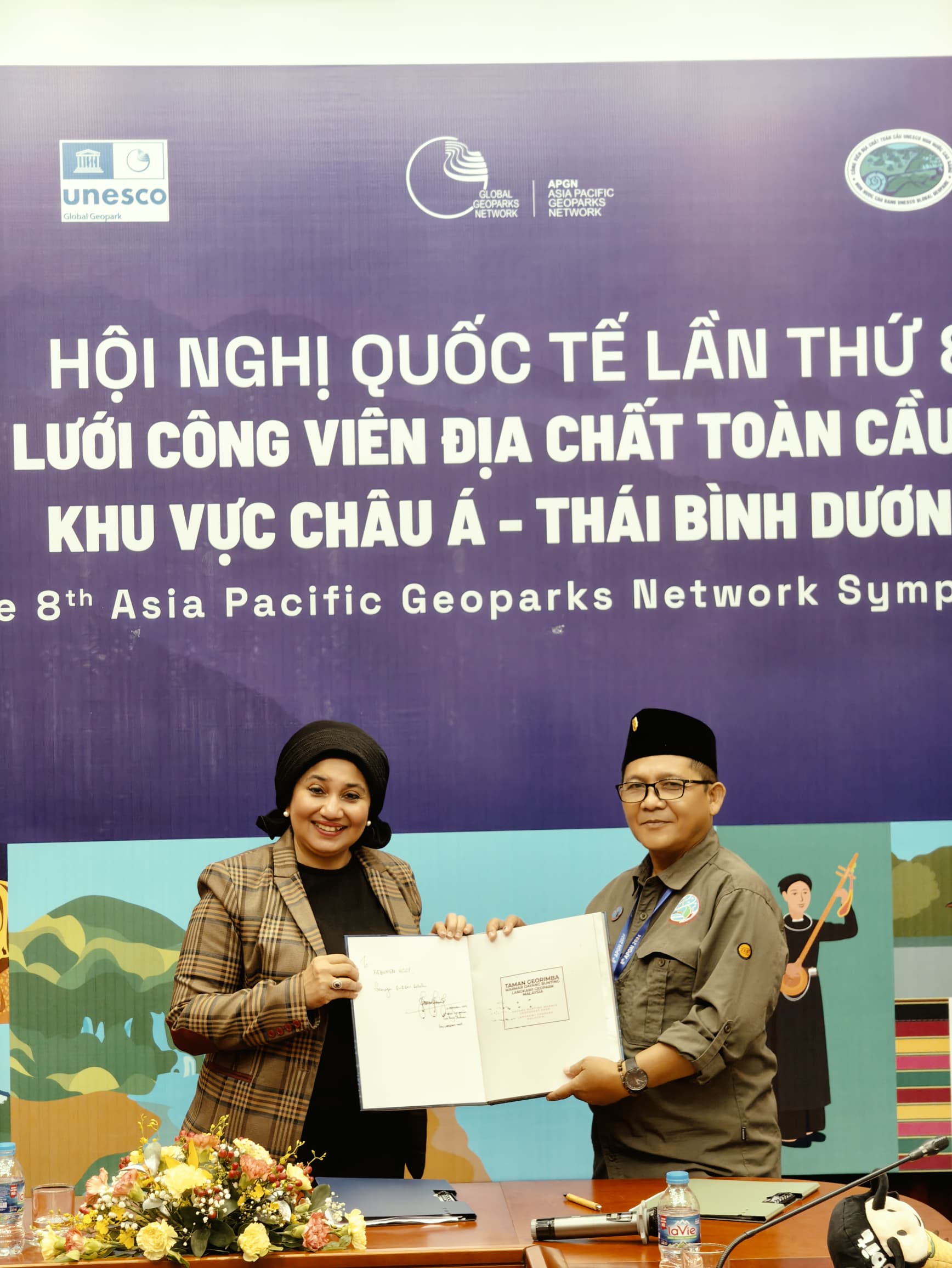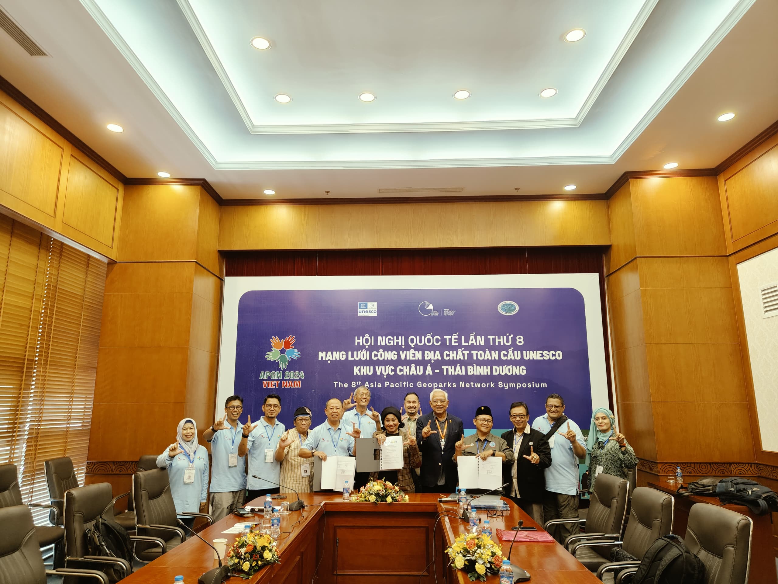 Penandatanganan kesepakatan dilakukan oleh General Manager masing-masing Pengelola Geopark disaksikan Ketua Jaringan Geopark Asia Pasifik, Prof. Ibrahim Komoo.