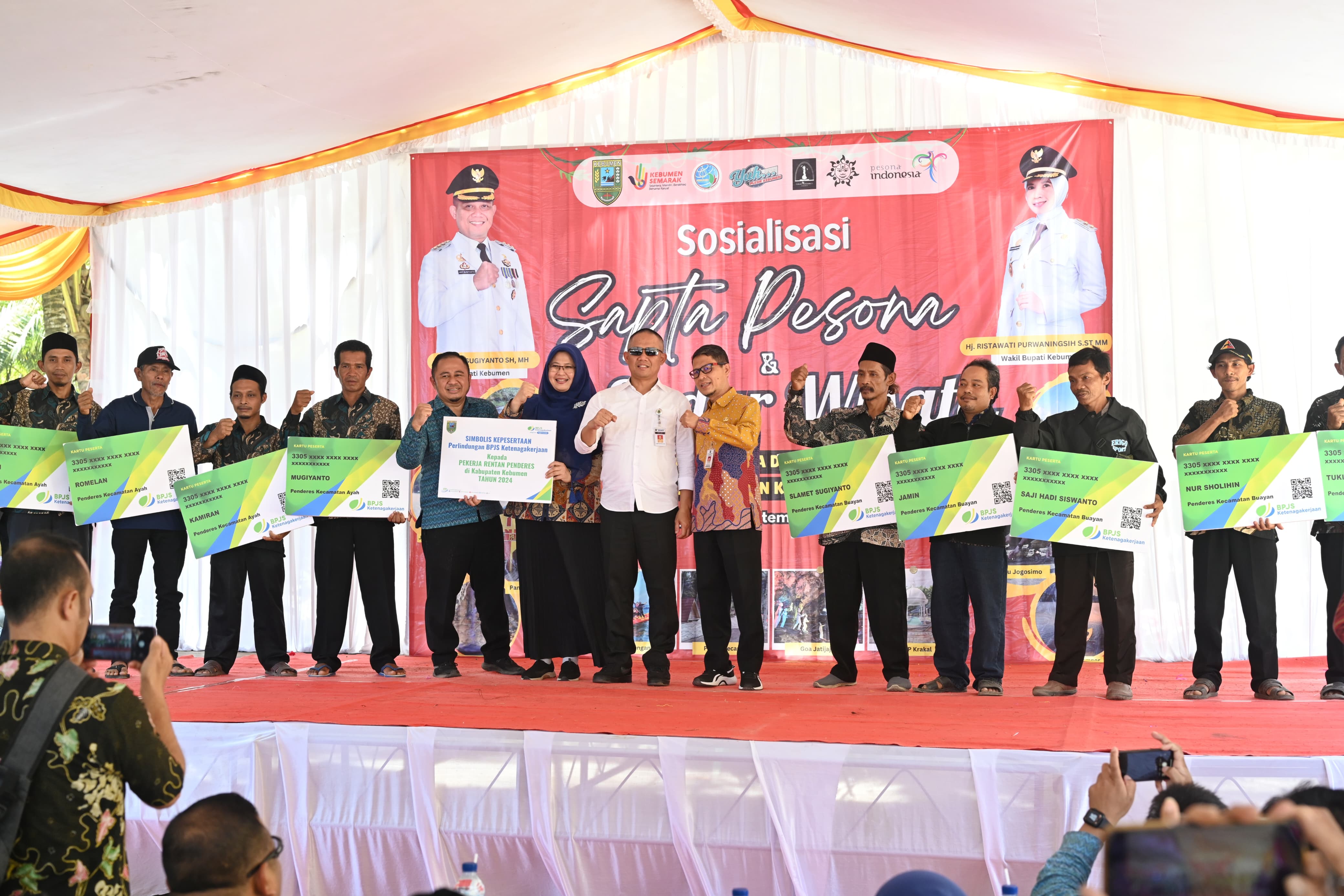 Penyerahan kartu BPJS Ketenagakerjaan secara simbolis diserahkan Bupati kepada 10 penderes di obyek wisata Pantai Pecaron, Desa Srati, Kecamatan Ayah, pada Kamis 19 September 2024. Kegiatan ini turut dihadiri Dandim 0709 Letkol CZi Ardianta Purwandhana, Ketua TP PKK Kebumen Iin Windarti, pimpinan OPD.