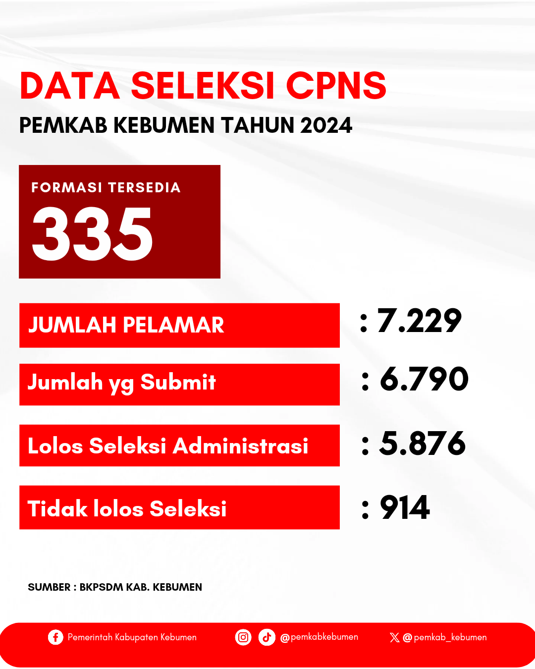 Kepala Badan Kepegawaian dan Pengembangan Sumber Daya Manusia Moh Amirudin mengatakan, antusias masyarakat Kebumen dan sekitarnya untuk mengikuti seleksi CPNS tahun ini luar biasa banyaknya. Dari ribuan pendaftar, pemerintah hanya membutuhkan 335 formasi, terdiri dari 5 tenaga kesehatan, dan 330 tenaga teknis.