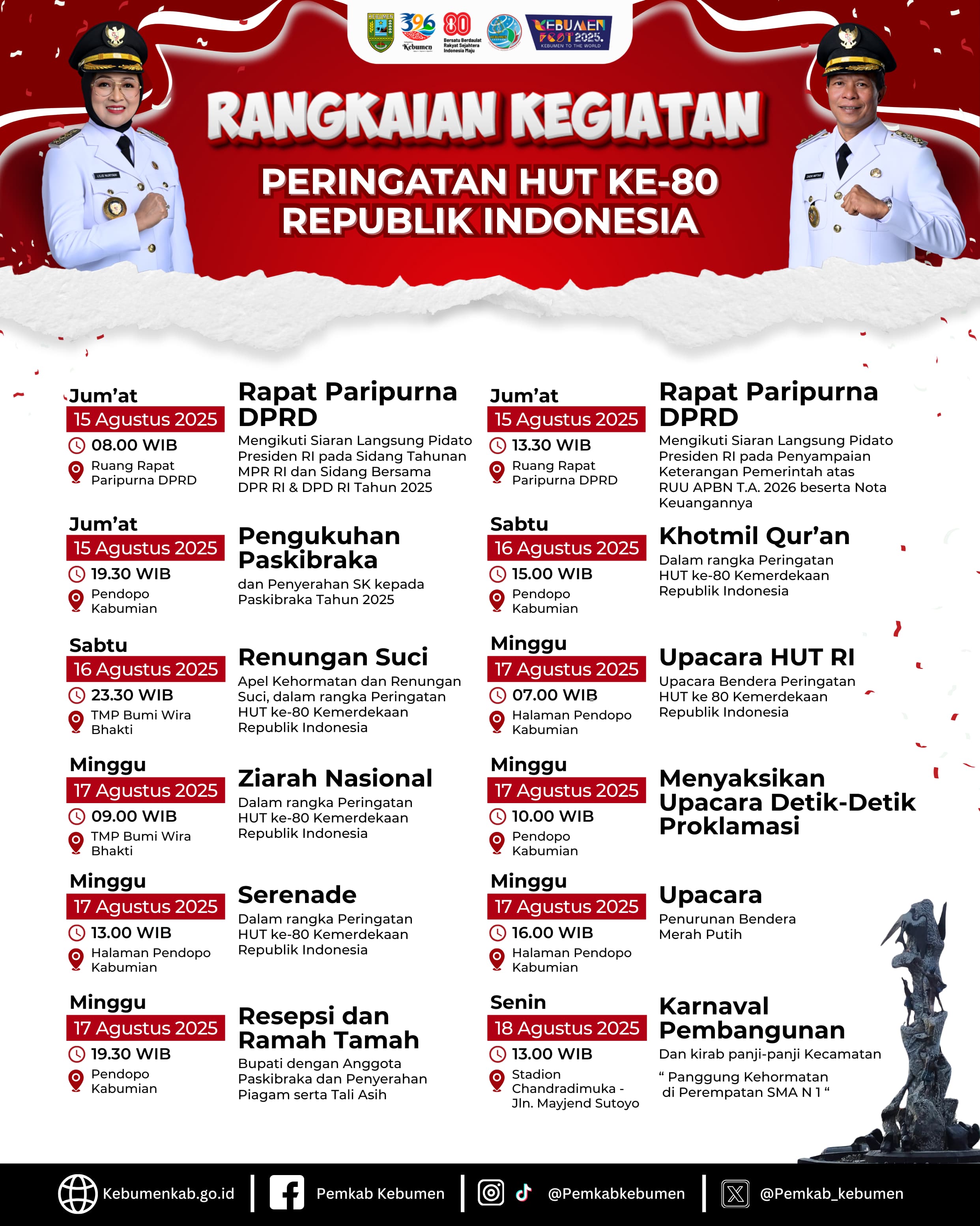 " Rangkaian kegiatan akan dimulai pada tanggal 15 agustus pukul 8 pagi dengan Rapat Paripurna dengan agenda Mengikuti Siaran Langsung Pidato Presiden RI pada Sidang Tahunan MPR RI dan Sidang Bersama DPR RI & DPD RI Tahun 2025, Kemudian pada Pukul 15.30 akan didakan Rapat Paripurna dengan agenda Mengikuti Siaran Langsung Pidato Presiden RI pada Penyampaian Keterangan Pemerintah atas RUU APBN T.A. 2026 beserta Nota Keuangannya. Pada Malam harinya Pukul 19.30 WIB dilakukan Pengukuhan Paskibraka dan Penyerahan SK kepada anggota Paskibraka Kebumen Tahun 2025 di Pendopo Kabumian."