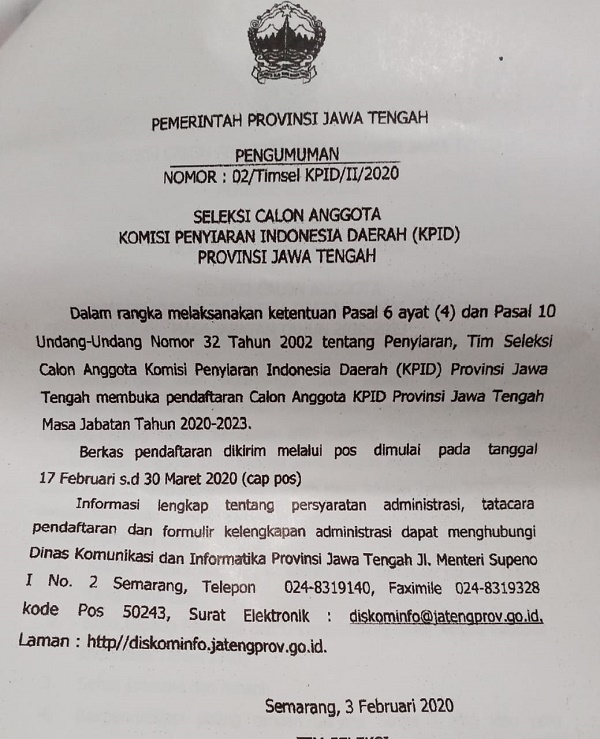 Pengumuman Seleksi Calon Anggota KPID Provinsi Jateng