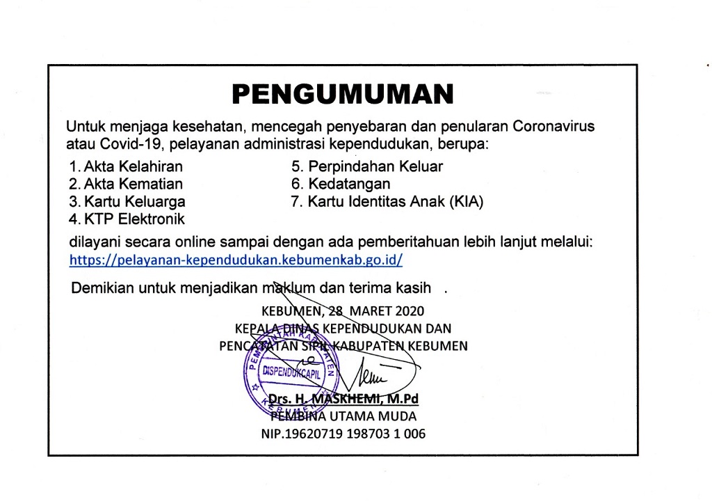 Berikut Kami sampaikan perubahan pelayanan di Dispendukcapil Kabupaten Kebumen. Untuk keterangan lebih lengkap, informasi perubahan layanan dapat diunduh pada file di bawah ini