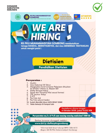 Dengan adanya kesempatan ini, RS PKU Muhammadiyah Gombong berharap dapat merekrut tenaga dietisien yang berintegritas tinggi, siap bekerja profesional, serta mampu memberikan pelayanan terbaik kepada masyarakat.