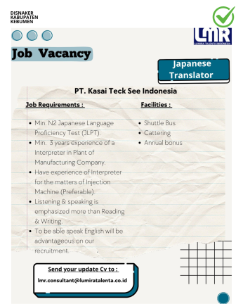 Saat ini, PT Kasai Teck See Indonesia membuka lowongan untuk posisi Japanese Translator dengan persyaratan dan fasilitas sebagai berikut: