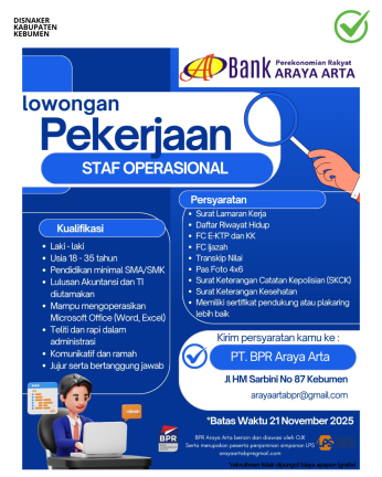 KEBUMEN – PT Bank Perkreditan Rakyat (BPR) Araya Arta membuka kesempatan kerja bagi masyarakat Kebumen dan sekitarnya untuk bergabung sebagai Staf Operasional. Sebagai lembaga keuangan yang berkomitmen melayani masyarakat, BPR Araya Arta terus berupaya menciptakan layanan perbankan yang profesional, transparan, dan berorientasi pada pengembangan ekonomi lokal. Melalui rekrutmen ini, perusahaan berharap dapat menjaring tenaga kerja muda yang kompeten dan berdedikasi tinggi untuk tumbuh bersama BPR Araya Arta.