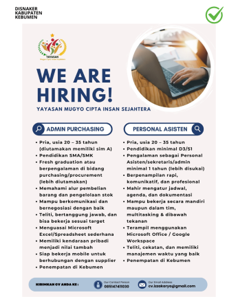 Yayasan Mugyo Cipta Insan Sejahtera membuka kesempatan bagi talenta muda yang berdedikasi dan siap berkembang dalam lingkungan kerja profesional. Lowongan ini ditujukan bagi kandidat berkompeten yang siap bergabung dan ditempatkan di Kebumen.
