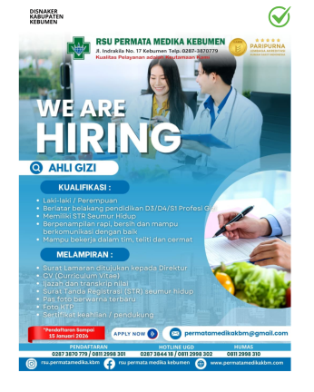 RSU Permata Medika Kebumen mengimbau para pencari kerja yang memenuhi kualifikasi untuk segera mengajukan lamaran sebelum batas waktu yang ditentukan. Kesempatan ini diharapkan dapat dimanfaatkan sebaik mungkin oleh tenaga gizi yang ingin berkontribusi dalam peningkatan pelayanan kesehatan di Kabupaten Kebumen.