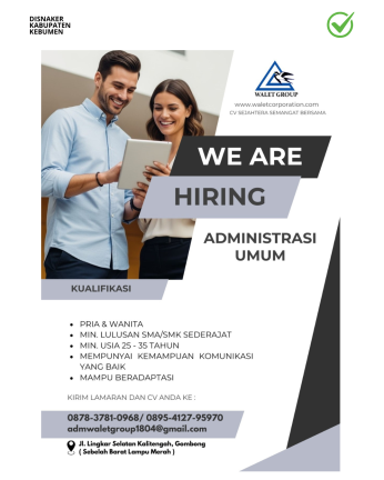 KEBUMEN – Kabar baik bagi pencari kerja di wilayah Kebumen dan sekitarnya. Walet Group membuka lowongan kerja untuk posisi Administrasi Umum dengan kesempatan bagi lulusan minimal SMA/SMK sederajat.