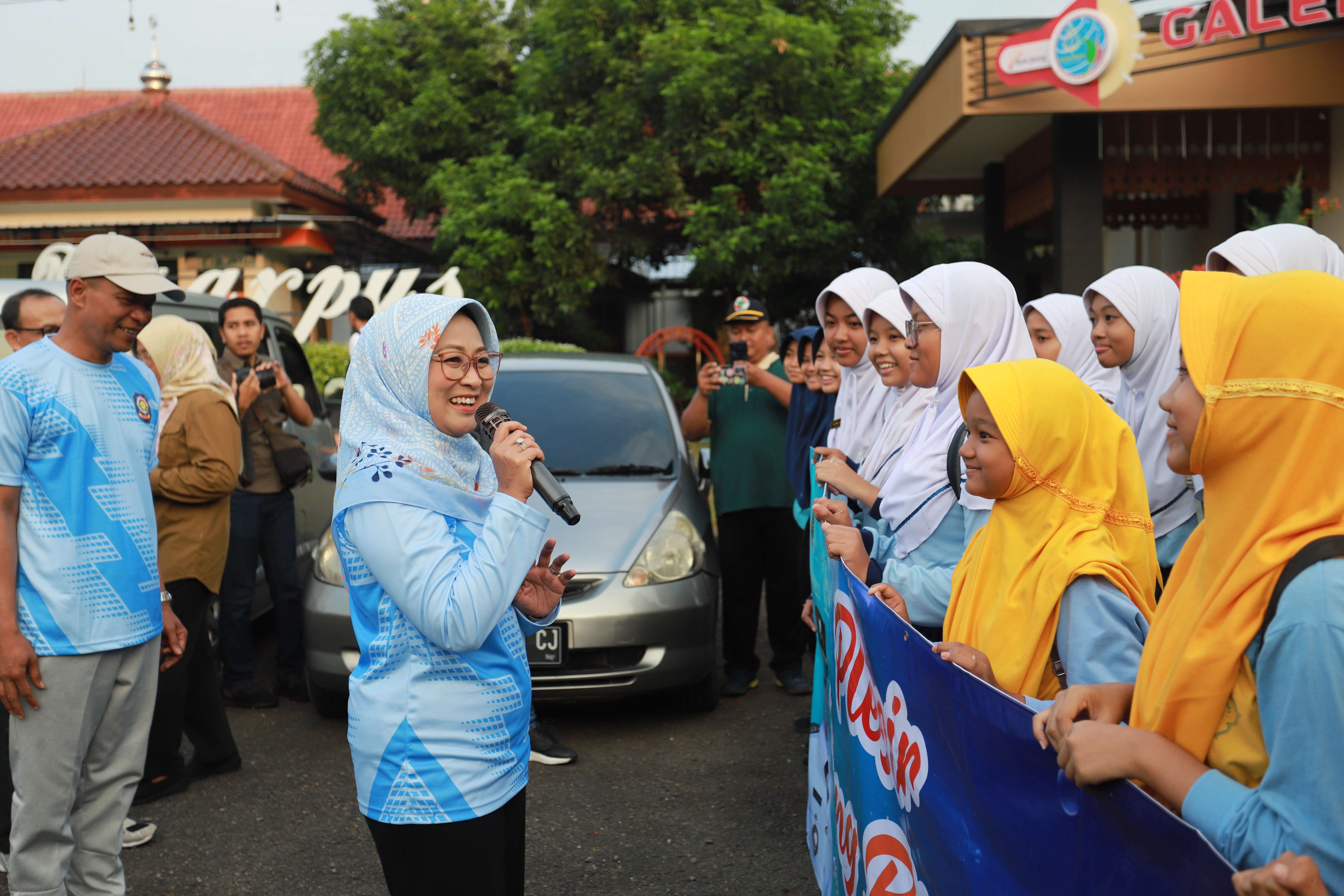 KEBUMEN - Bupati Kebumen Lilis Nuryani melepas para siswa siswi SMP yang mengikuti program Plesir Bareng Biyunge. Pelepasan berlangsung di depan Dinas Kearsipan dan Perpustakaan, Ahad 4 Mei 2025.