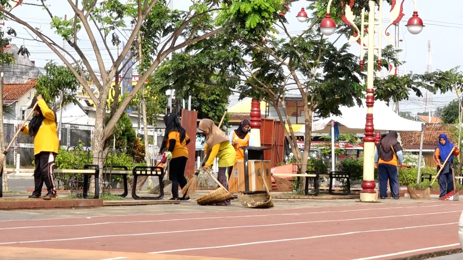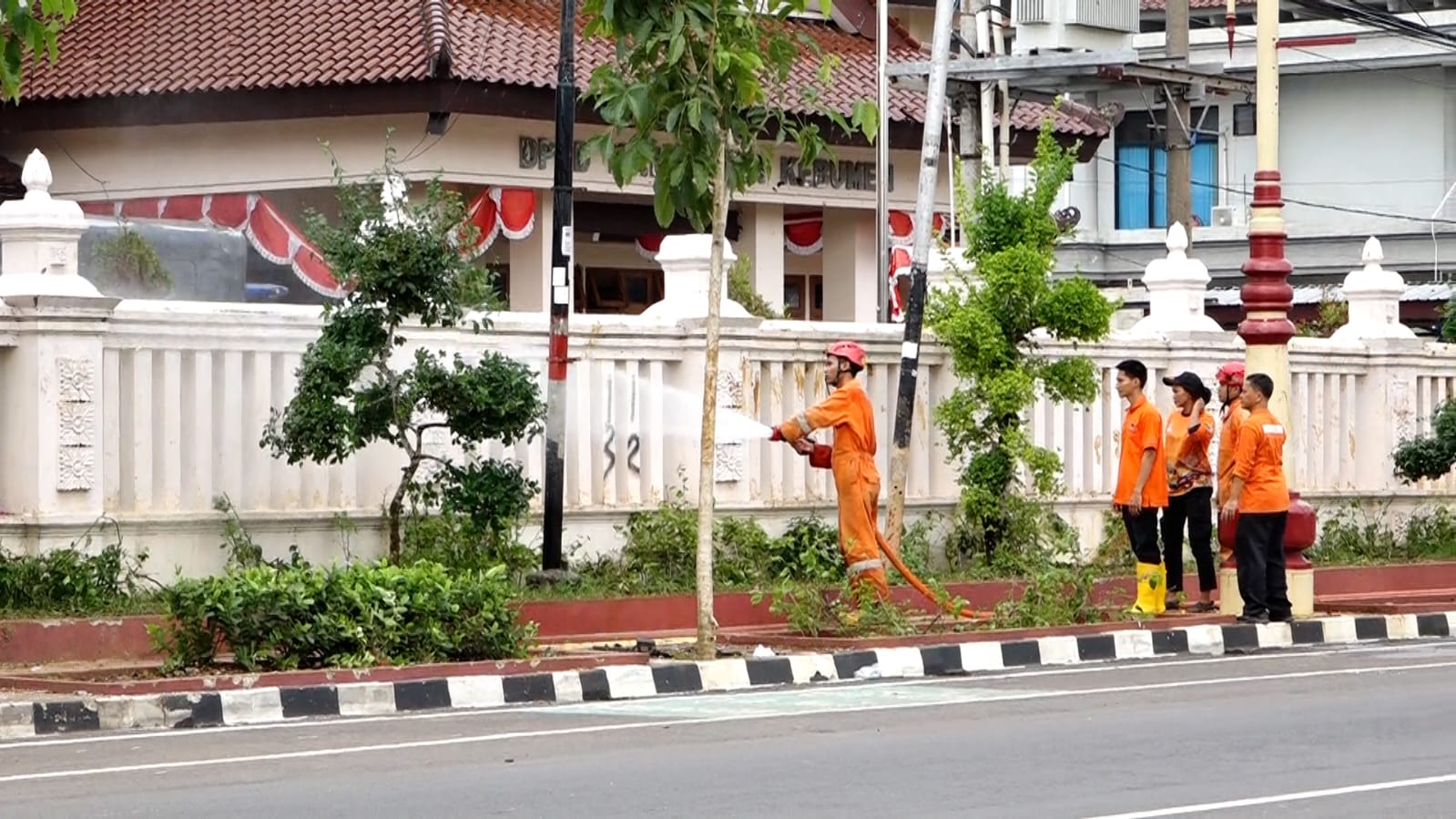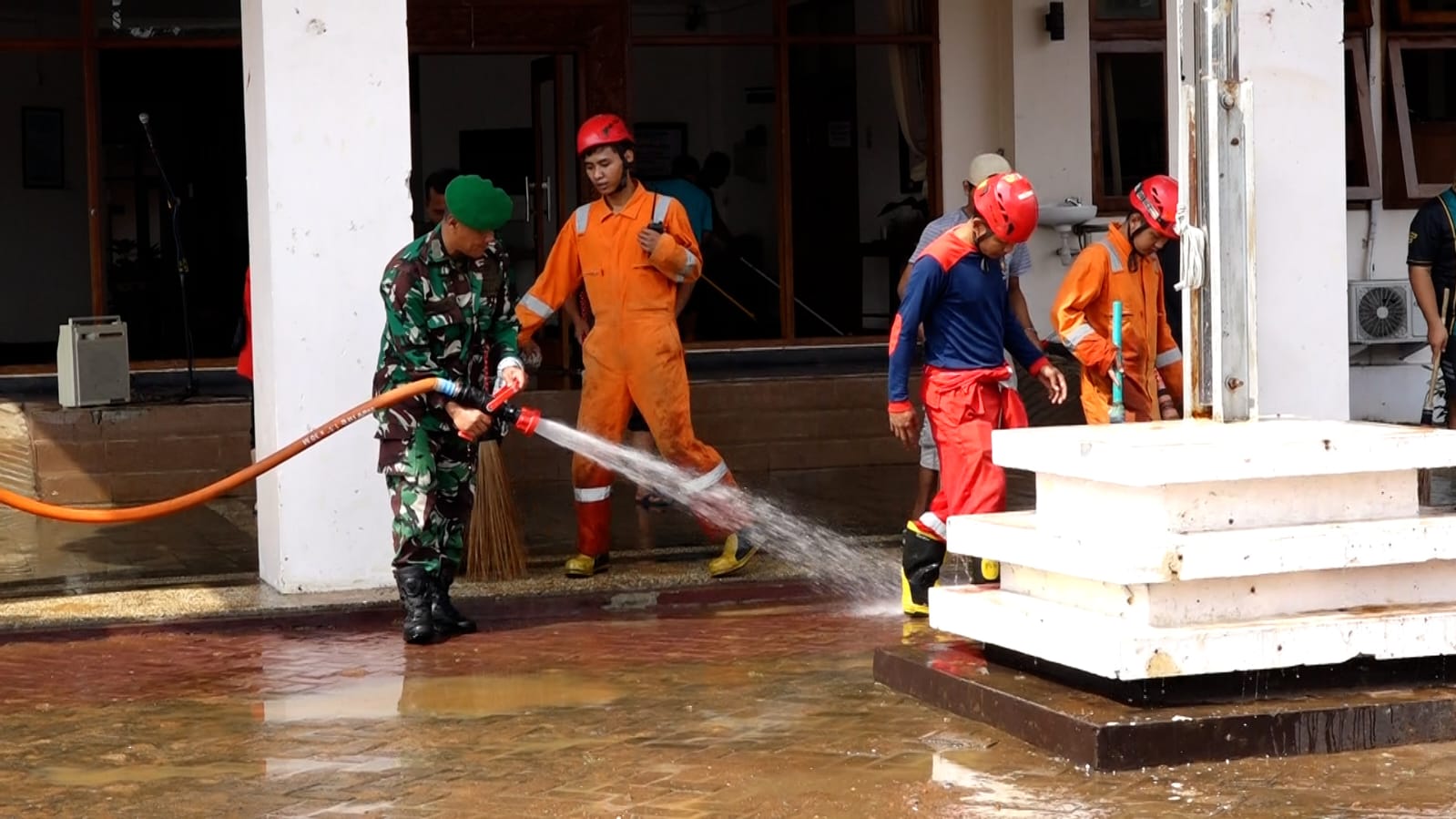 Menggunakan alat seperti sapu lidi, serta semprotan air dari mobil DAMKAR, BPBD dan Water Cannon milik Polres, mereka membersihkan setiap sudut halaman gedung DPRD hingga jalan Merdeka, serta alun-alun Pancasila. Sampah yang terkumpul langsung diangkut menggunakan dump truck milik DLHKP.