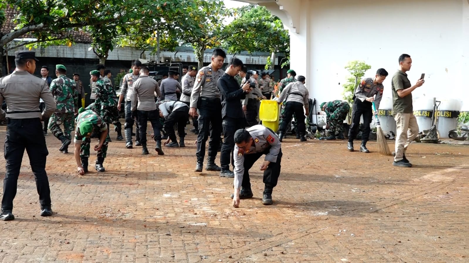 Dalam kegiatan yang dilaksanakan Minggu pagi (31/8/25), sekitar pukul 09.00 WIB terilihat sejumlah personil TNI dan Polri bersama pasukan kuning ,BPBD dan DAMKAR, dengan semangat kebersamaan menyapu, membersihkan dan mengumpulkan sampah sisa-sisa demo, bahkan mengecat tembok gedung DPRD.