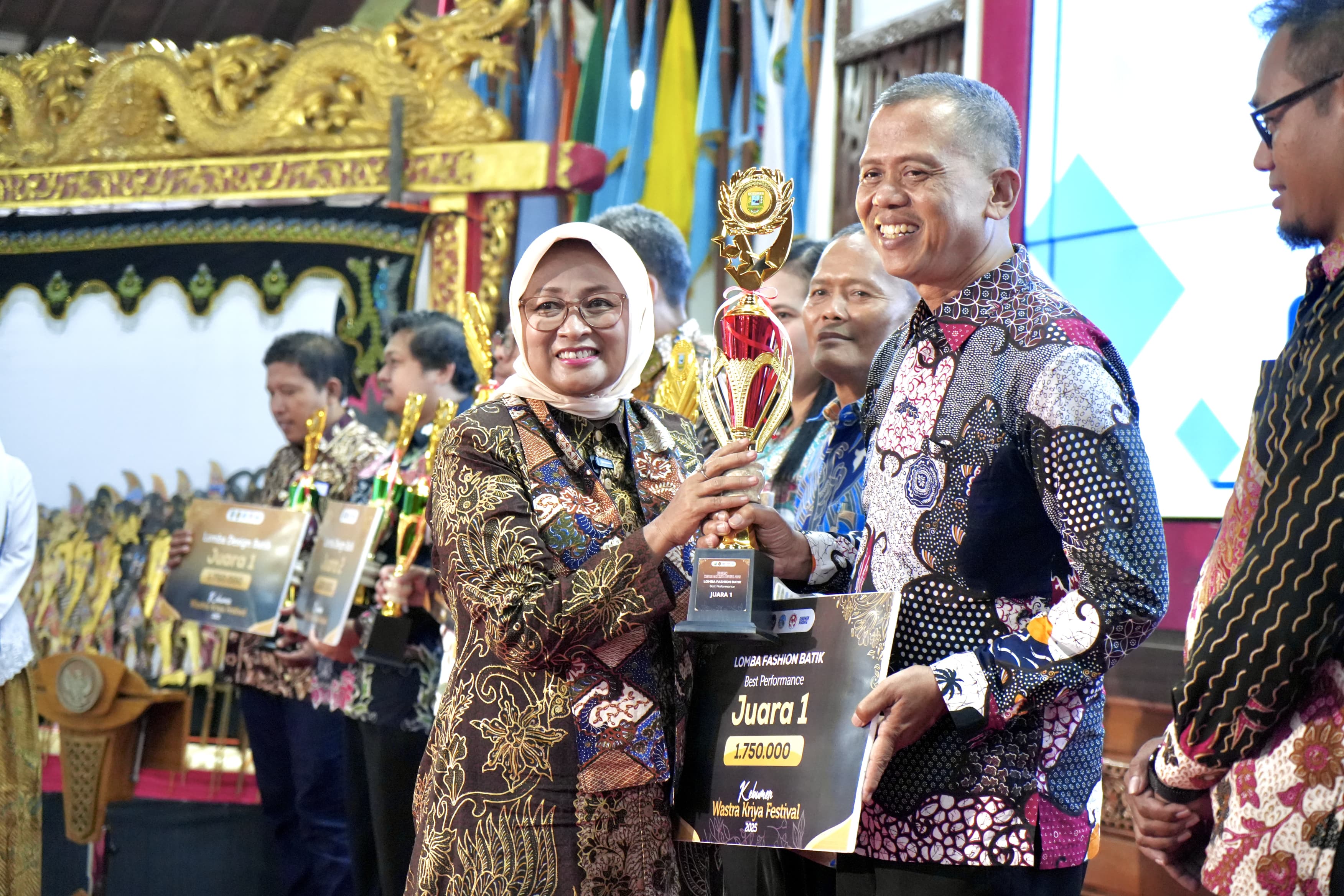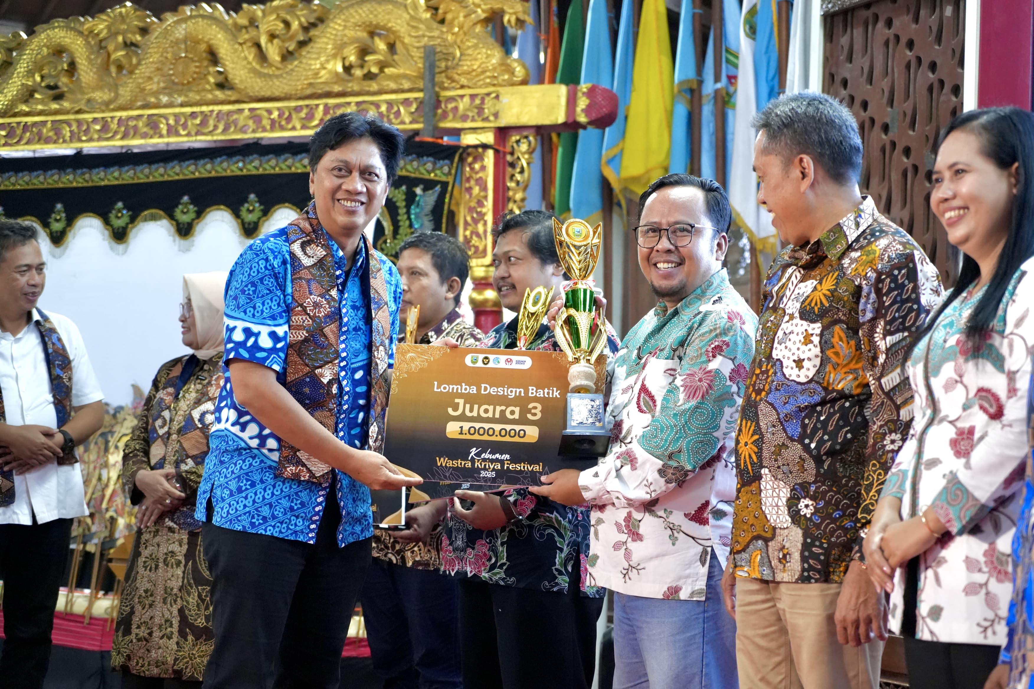 Kebumen Wastra dan Kriya Festival 2025 sukses diselenggarakan dengan melombakan tiga kategori utama. Untuk Lomba Desain Batik, Kecamatan Mirit berhasil tampil sebagai Juara 1 dengan total nilai 770, diwakili oleh Gus Sofyan dan Sudar. Mereka berhak mendapatkan trofi dan uang pelatihan sebesar Rp1.750.000.