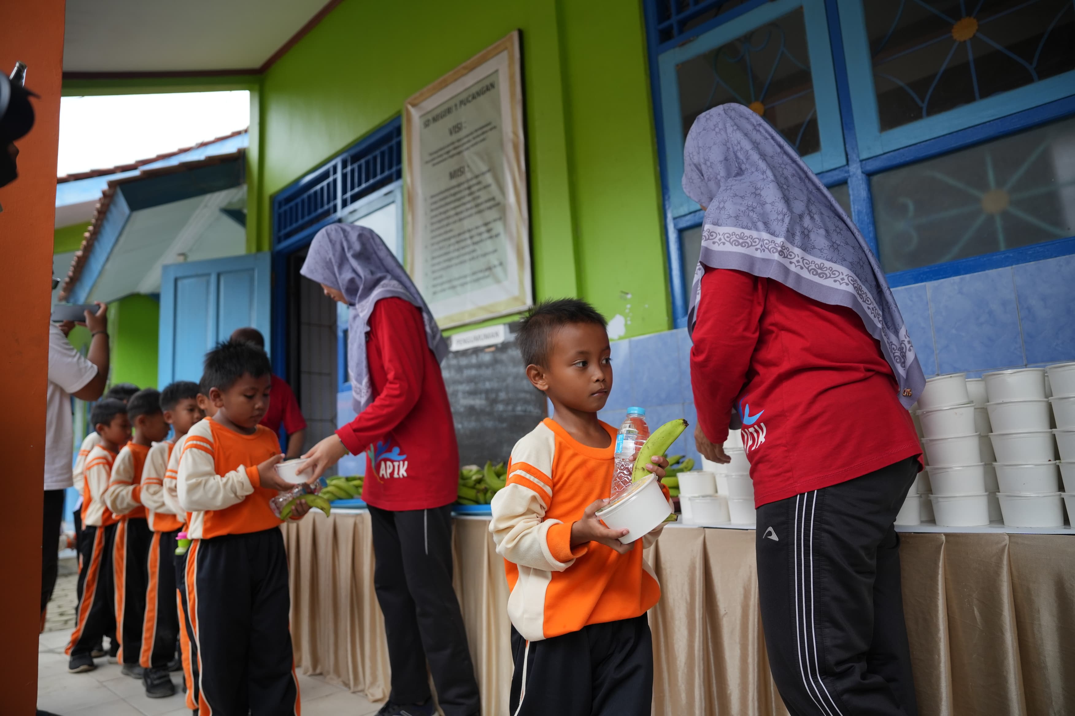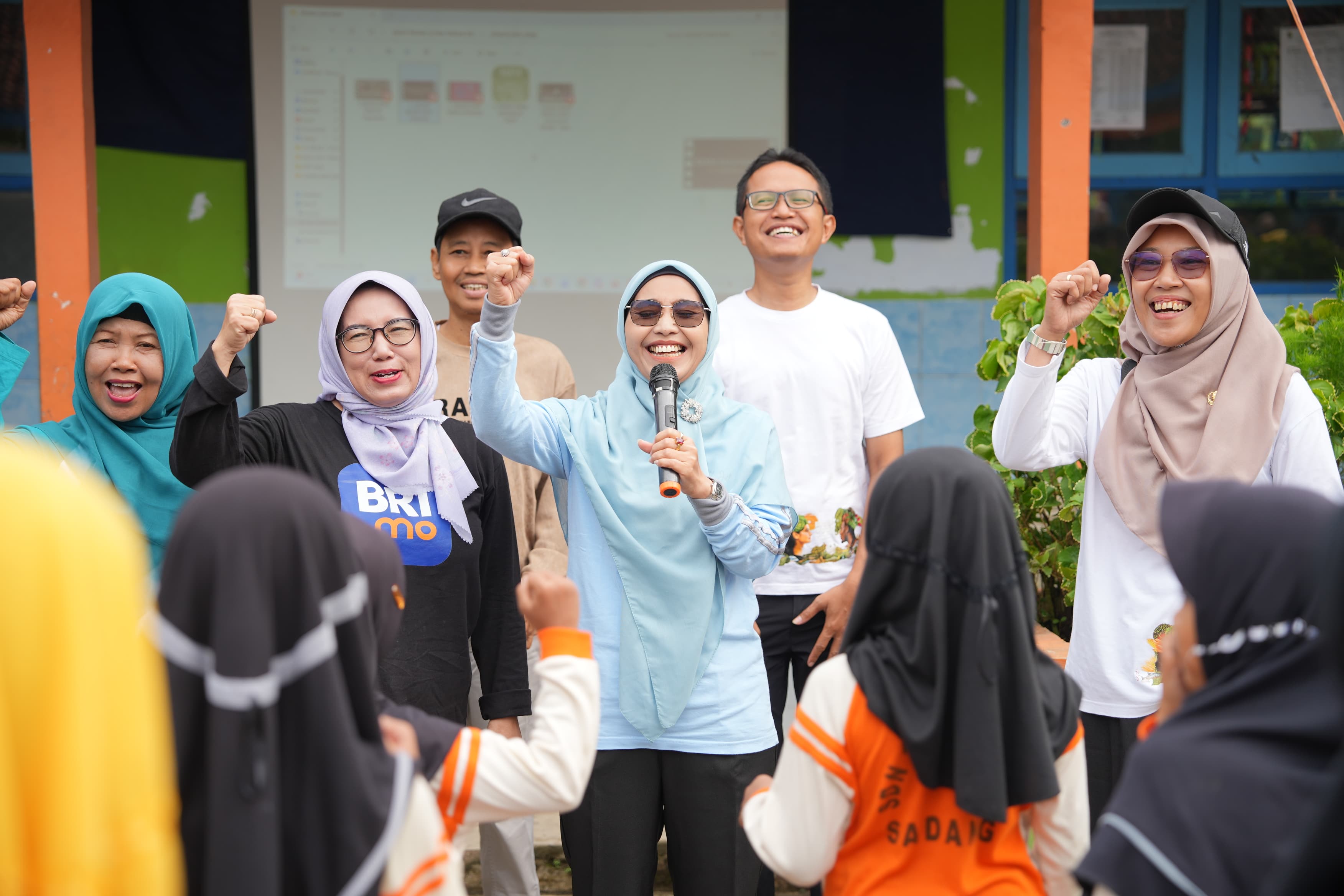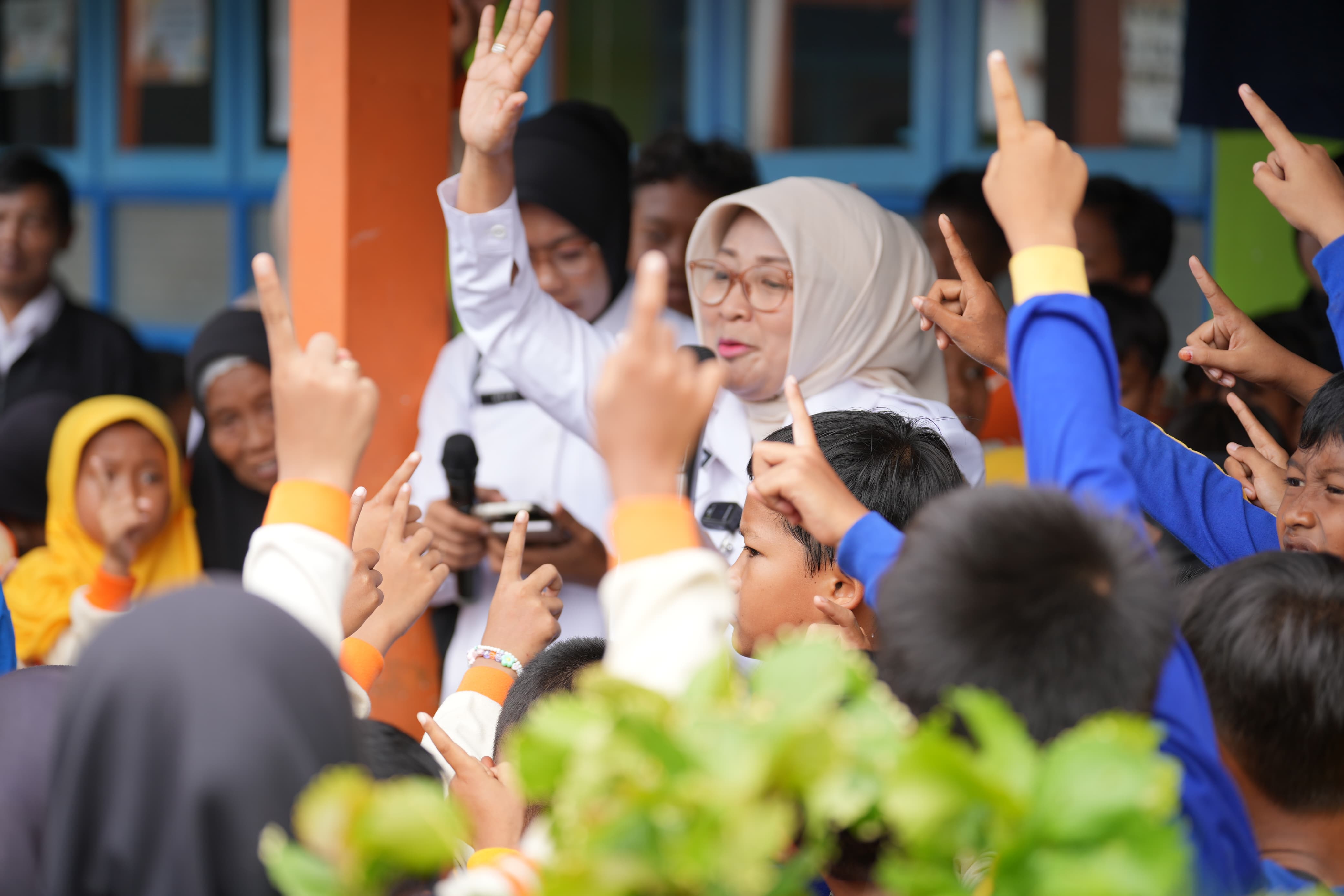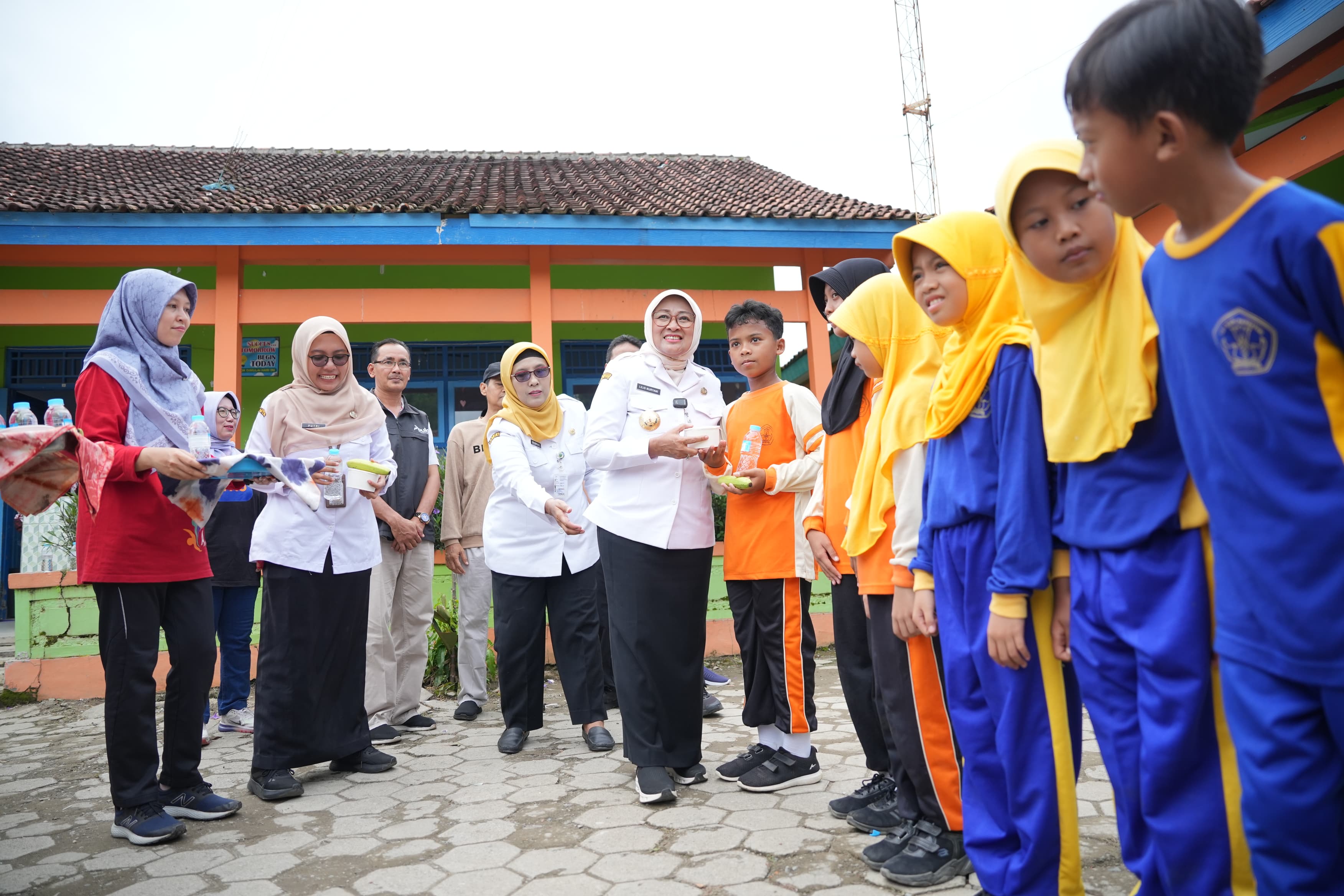 “Tadi sudah senam kan? Sudah pada sarapan belum? Siapa yang suka makan sayur?” sapa Bupati Lilis akrab kepada para murid.