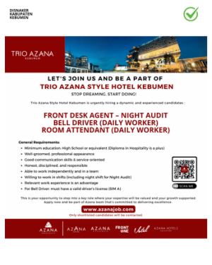 • Lowongan Kerja Trio Azana Style Hotel Kebumen.